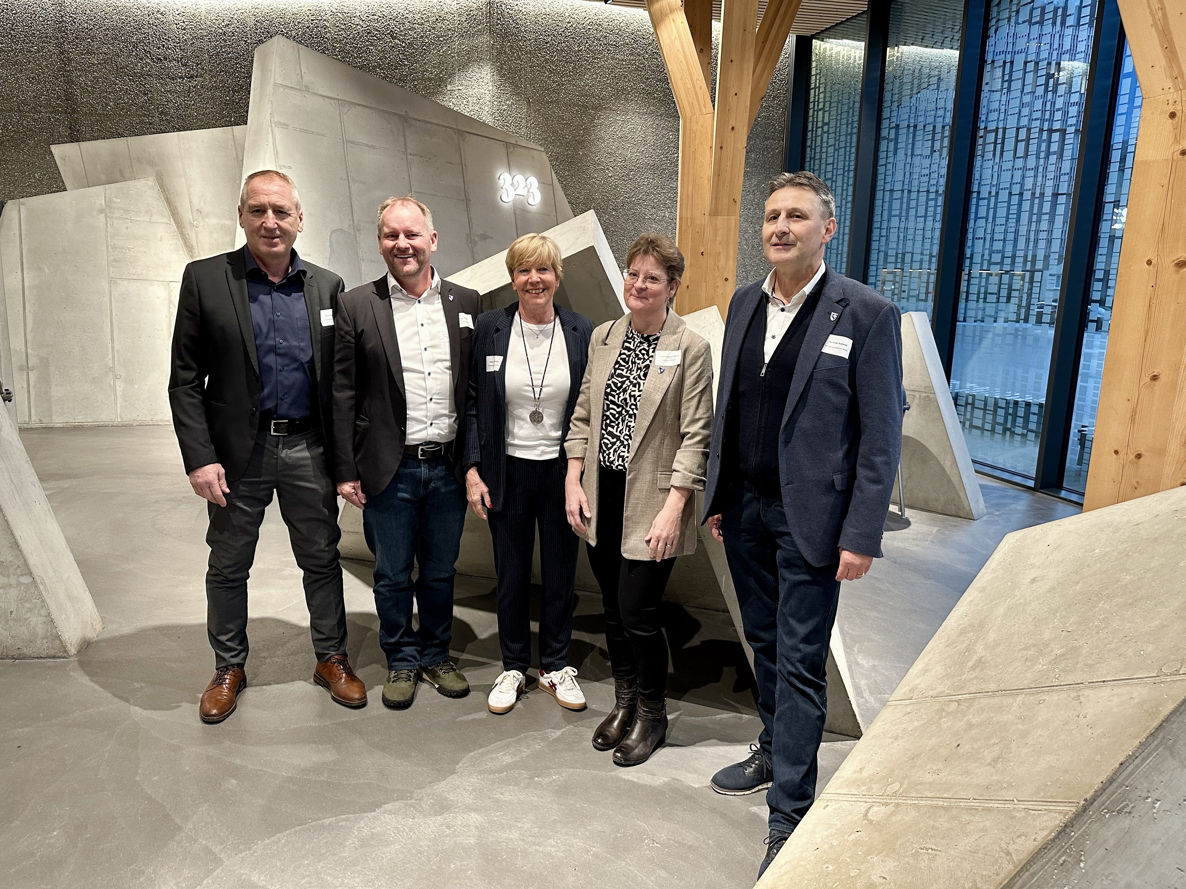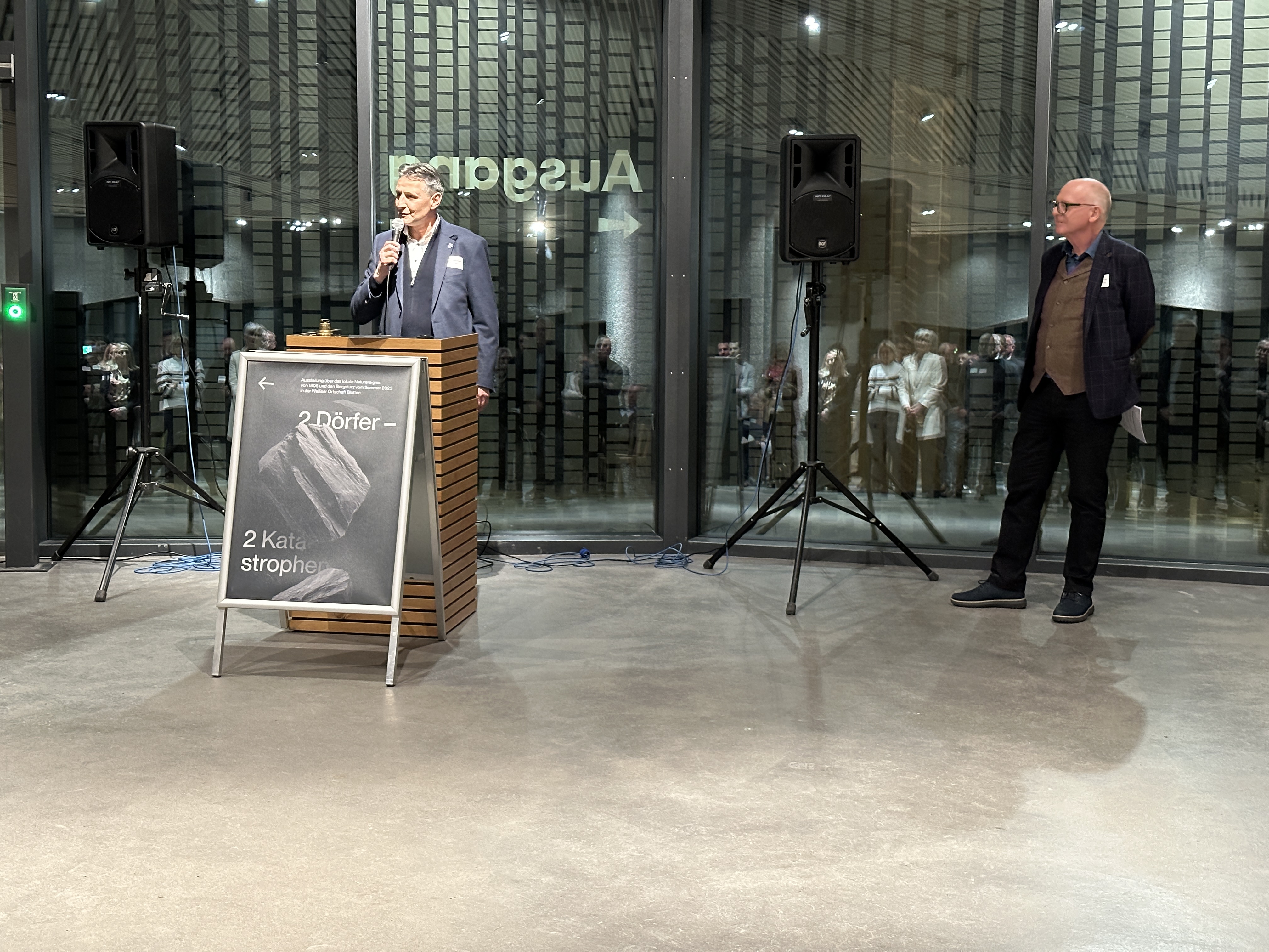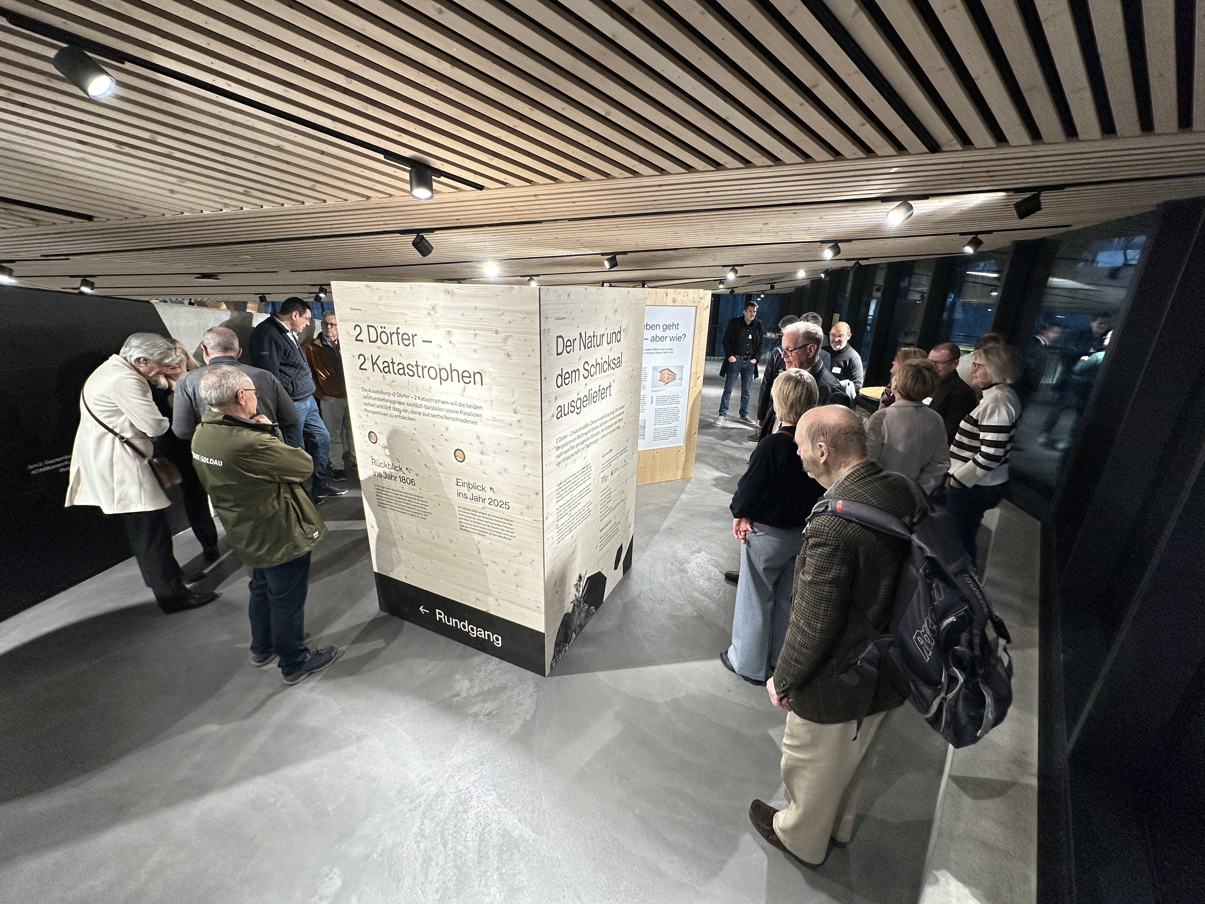 Gemeindepräsident Matthias Bellwald und zwei Mitglieder des Gemeinderats Blatten zeigten sich von der Ausstellung tief beeindruckt. Bellwald sagte: «Zwei Kata-strophen haben unsere Dörfer zerstört, doch der Wille zum Wiederaufbau und der Glaube an lebendige Dorfgemeinschaften sind stärker als jeder Felssturz.»